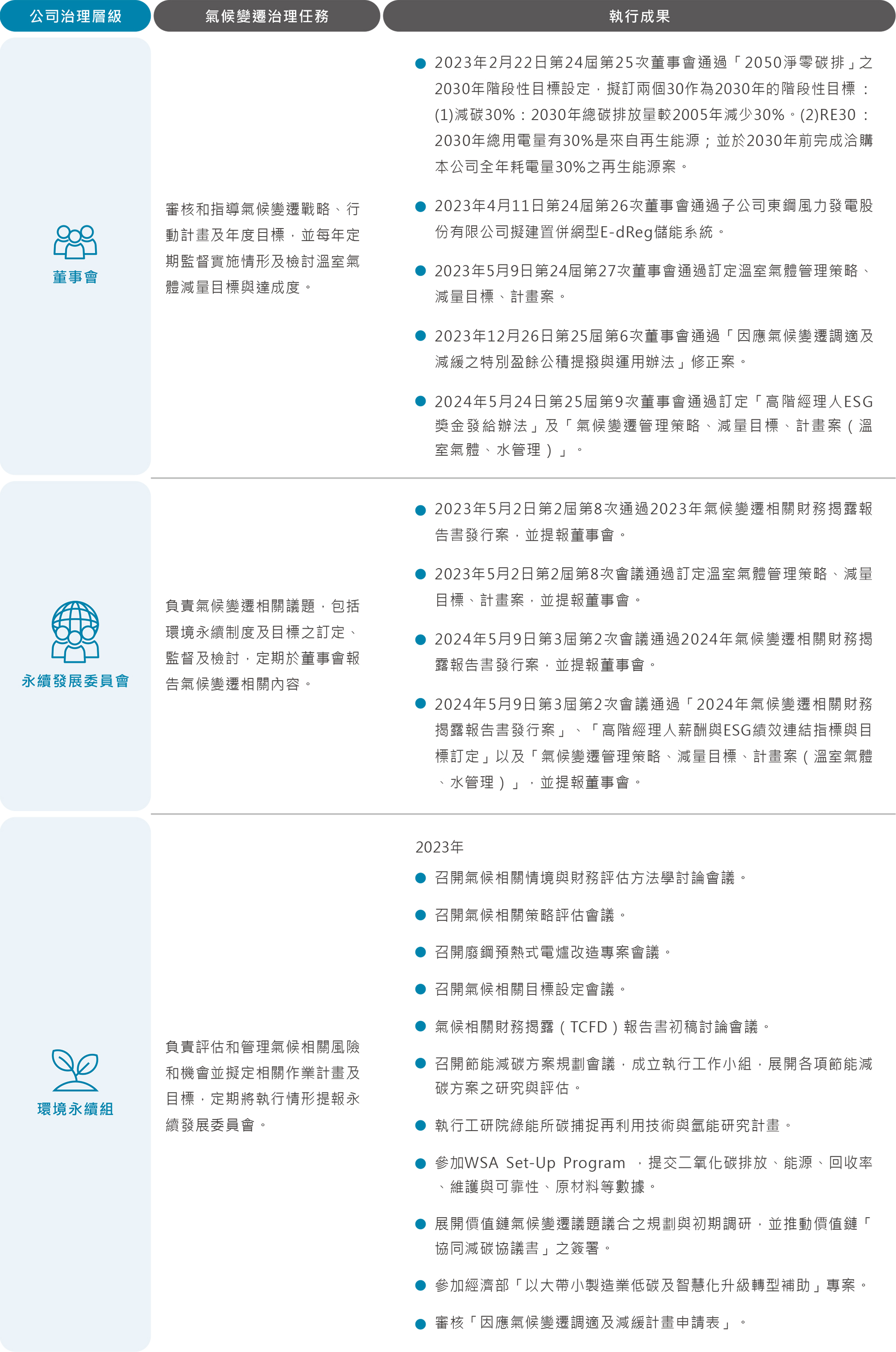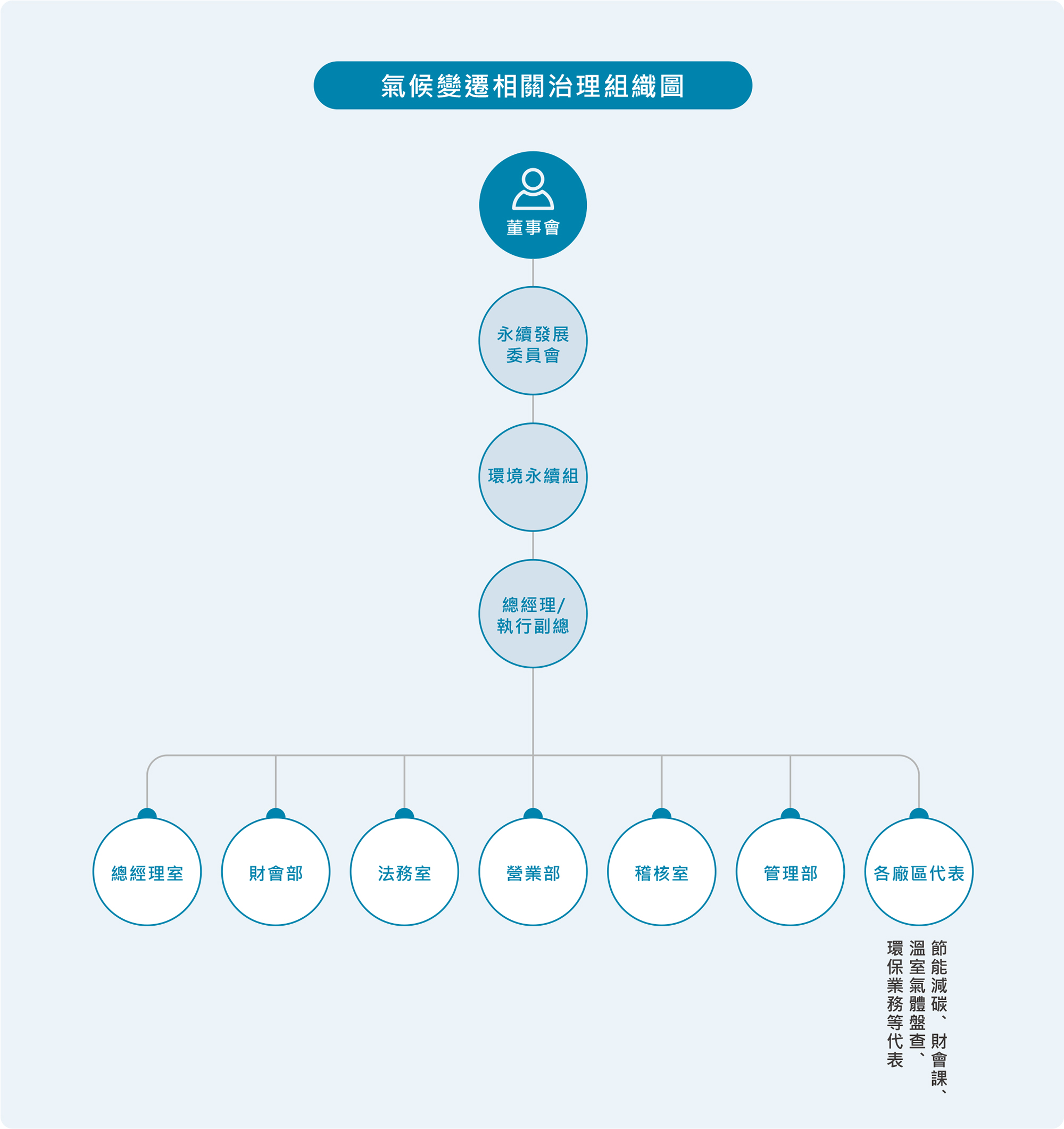 本公司董事會之永續(xù)發(fā)展委員會(功能性委員會)下設(shè)環(huán)境永續(xù)組,召集人為總經(jīng)理,副召集人為生產(chǎn)副總經(jīng)理,由各相關(guān)對應(yīng)部門指派人員組成,負責評估和管理氣候相關(guān)風險和機會及其策略與目標訂定,並持續(xù)進行分析與管控。環(huán)境永續(xù)組定期將執(zhí)行情形提報永續(xù)發(fā)展委員會。