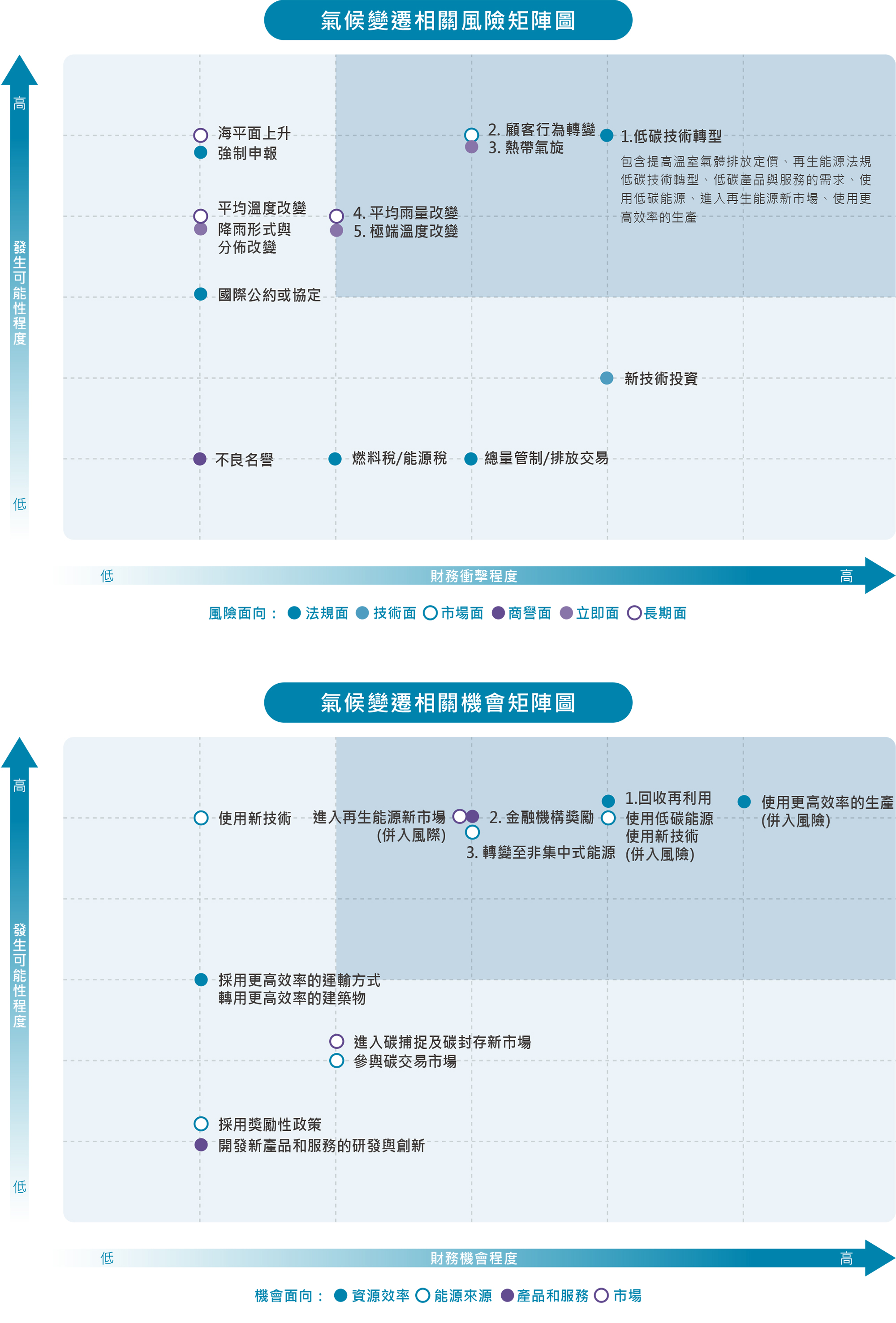 以下分別為鑑別後之氣候變遷相關(guān)風險與機會矩陣: