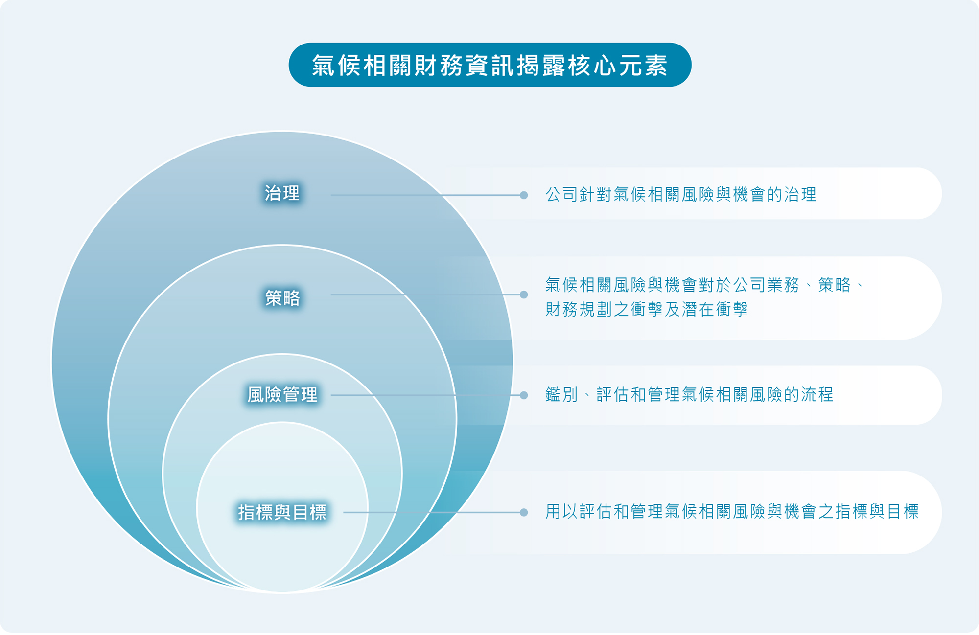 本公司董事會設(shè)有永續(xù)發(fā)展委員會,下設(shè)環(huán)境永續(xù)組、企業(yè)社會責任組、公司治理組,其中公司治理組負責公司治理、誠信經(jīng)營、風險管理等相關(guān)政策及管理機制之訂定、監(jiān)督及檢討。並負責協(xié)調(diào)相關(guān)部門進行風險辨識、評估、管制及監(jiān)督,定期向永續(xù)發(fā)展委員會報告執(zhí)行情形,由永續(xù)發(fā)展委員會每年至少一次向董事會報告整體風險管理執(zhí)行情形。各相關(guān)部門依職掌內(nèi)容評估各項風險因子發(fā)生之可能性與衝擊影響的程度,擬訂必要措施並落實執(zhí)行,妥善管理各項風險。本公司永續(xù)發(fā)展委員會之環(huán)境永續(xù)組為氣候變遷相關(guān)管理之專責單位。本公司已針對各種永續(xù)與氣候變遷相關(guān)之國際倡議活動 / 組織之內(nèi)容進行瞭解,將國際倡議活動所關(guān)切的重點以及評估準則,納入公司制定環(huán)境及溫室氣體政策時的考量,以便符合國際發(fā)展趨勢,並增進公司因應(yīng)氣候變遷之能力。