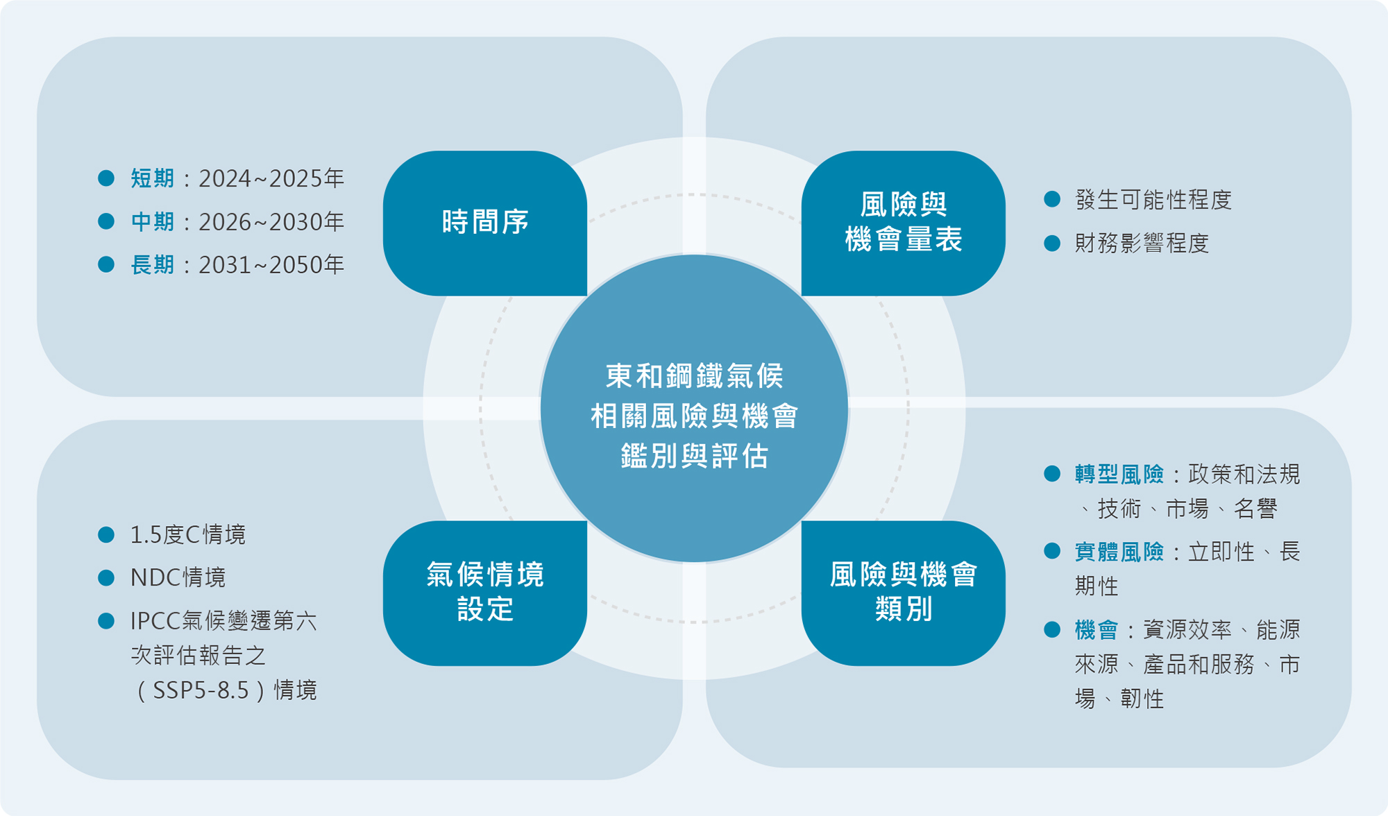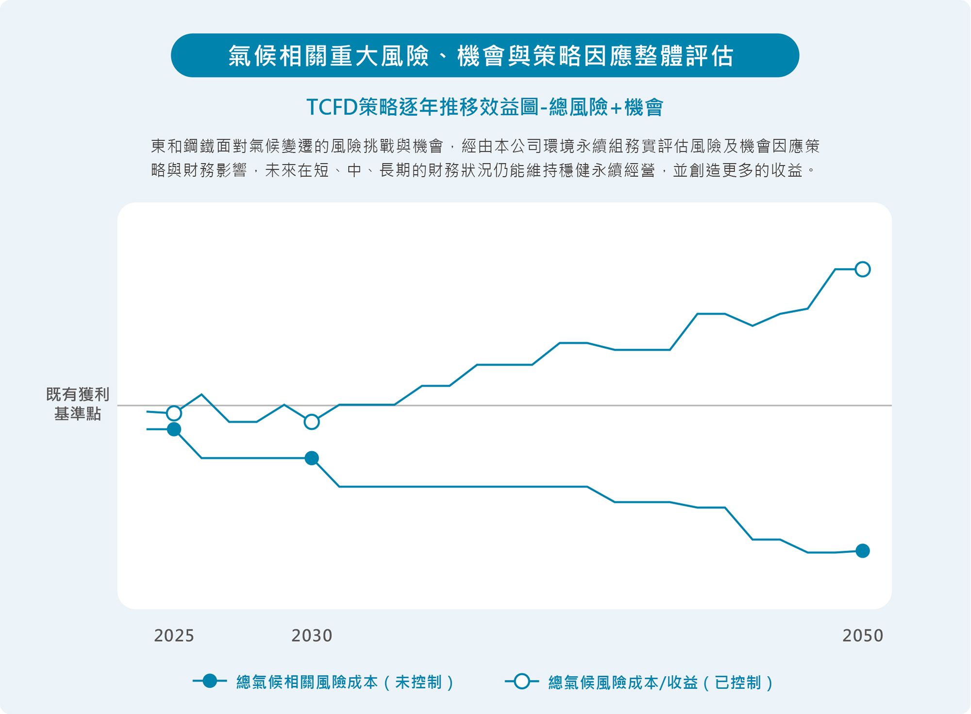 東和鋼鐵面對氣候變遷的風險挑戰(zhàn)與機會,經(jīng)由本公司環(huán)境永續(xù)組務(wù)實評估風險及機會因應(yīng)策略與財務(wù)影響,未來在短、中、長期的財務(wù)狀況仍能維持穩(wěn)健永續(xù)經(jīng)營,並創(chuàng)造更多的收益。