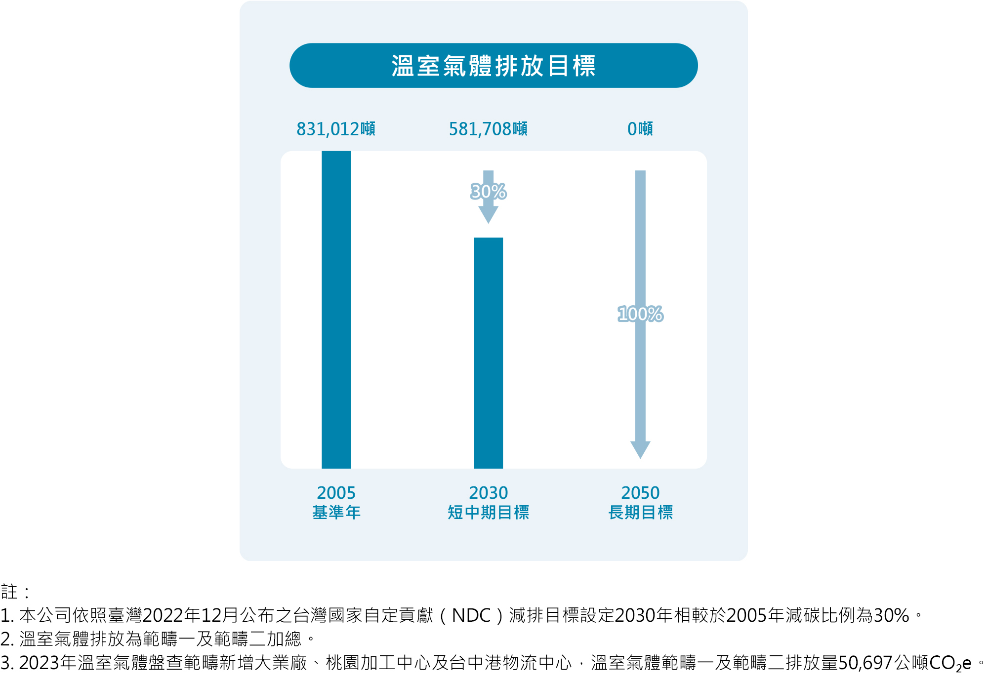 為因應(yīng)全球趨勢及我國2050淨零排放目標,本公司將氣候變遷納入永續(xù)發(fā)展之重大議題,並於第24屆第25次董事會通過本公司「2050淨零碳排」之2030年階段性目標: