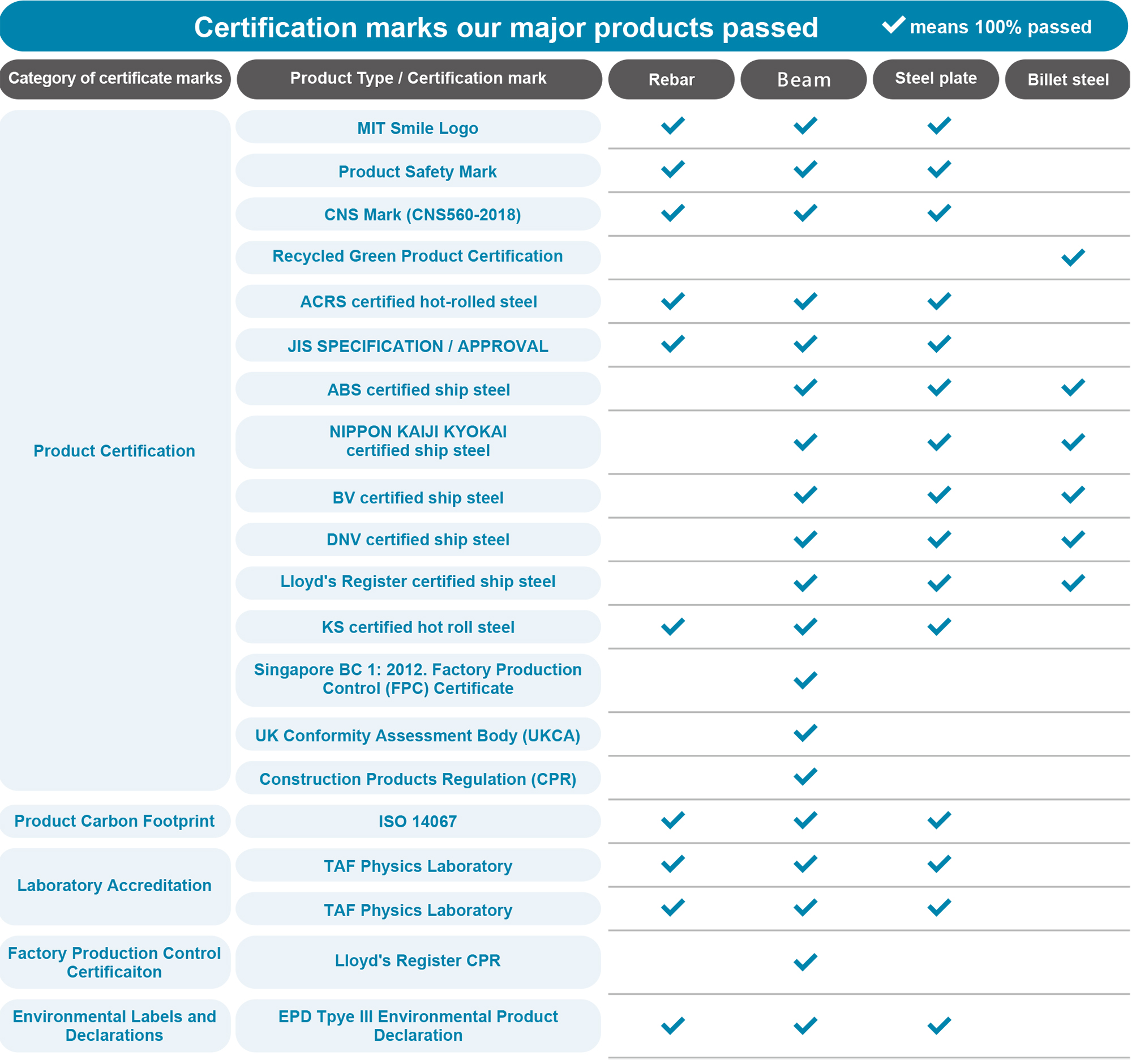 Our Rebar products have passed 10 types of certification marks while our beam and steel plate products passed 19 types of certification marks in 2023. All products meet the safety impact assessment improvement and legal requirements for product information, labeling and regulations. In addition, we also established and provide product purchase information and use instruction from customers’ perspective, attesting to our product quality, integrity, and our insistence that customers always come first. In 2023, the ACRS AS/NZS 4671 product certification was completed in March, the JIS Mark Certification JIS G3112 was completed in October.