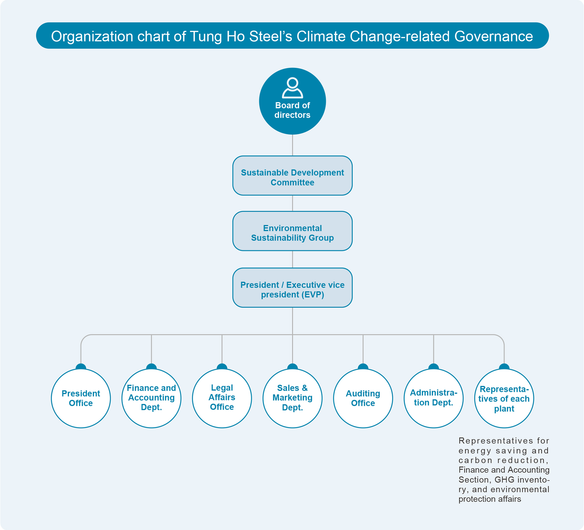 The Environmental Sustainability Group is established under the BOD’s Sustainable Development Committee (functional committee), which is composed of responsible personnel assigned by relevant departments. The chair of the Environmental Sustainability Group is the Executive Vice President, who is in charge of the evaluation and management of climate-related risks and opportunities and the setting of strategies and goals. The Environmental Sustainability Group will regularly report the implementation status to the Sustainable Development Committee.