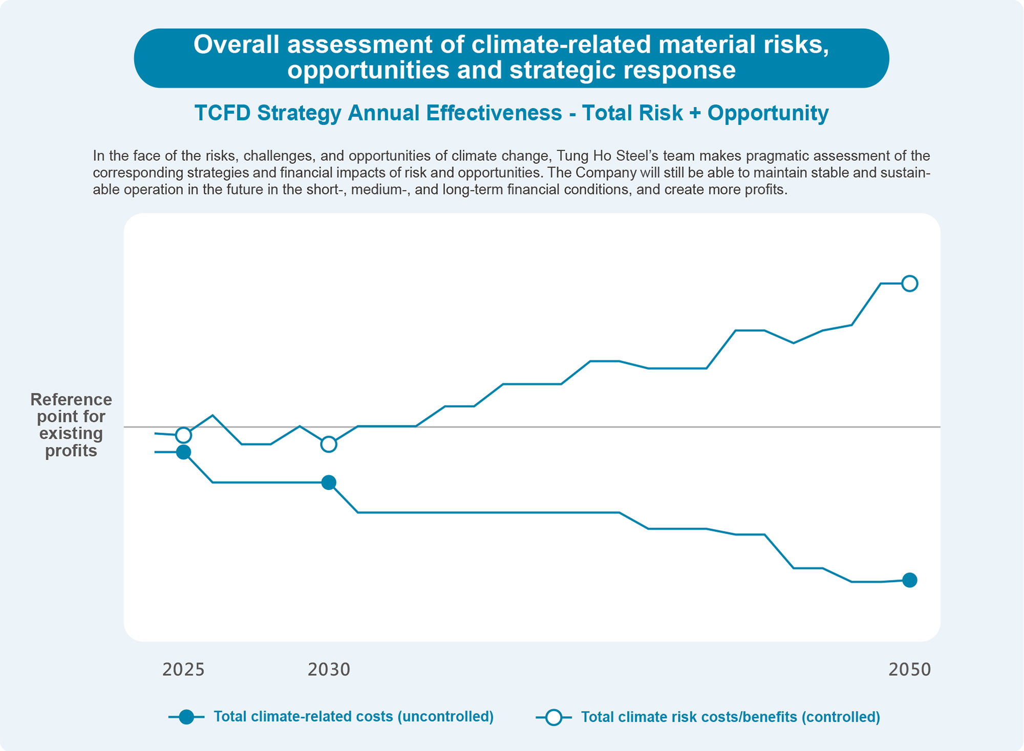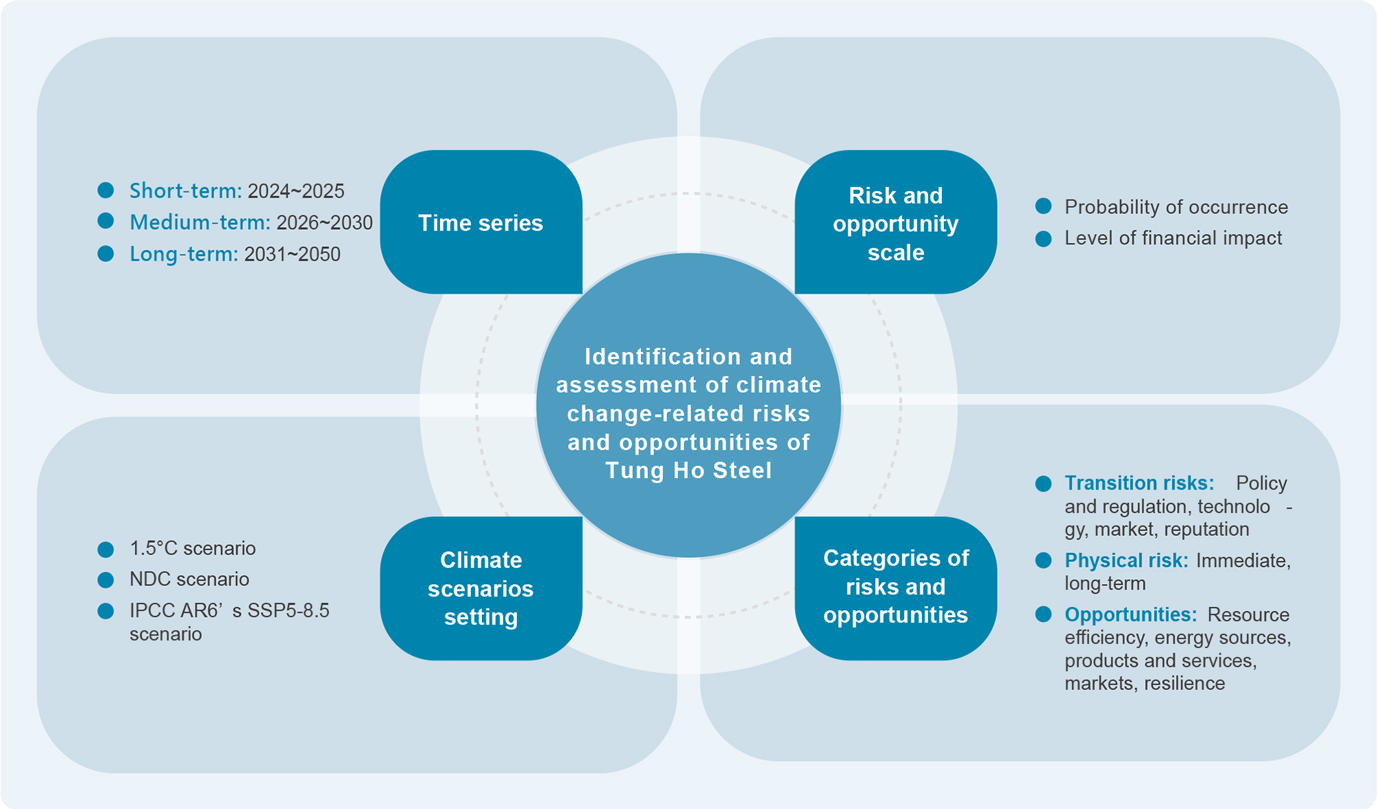 In the face of the risks, challenges, and opportunities of climate change, Tung Ho Steel’s team makes pragmatic assessment of the corresponding strategies and financial impacts of risk and opportunities. The Company will still be able to maintain stable and sustainable operation in the future in the short-, medium-, and long-term financial conditions, and create more profits.