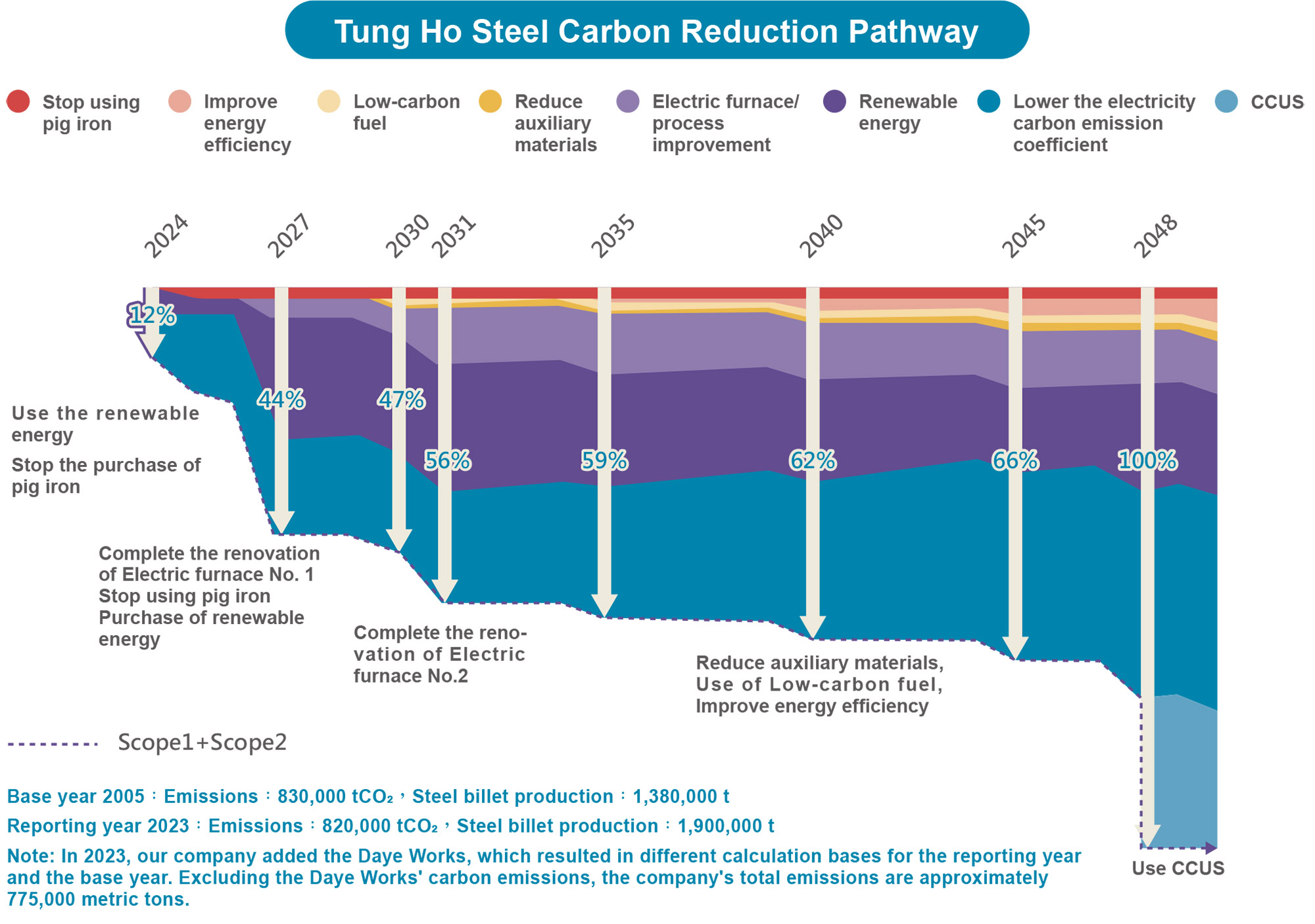 In the traditional steel production processes, milling iron is an indispensable raw material. However, the GHG emissions during the mining and refining stages of raw material- iron ore are much more than that of scrap steel. Therefore, it is an important option for the steel industry to produce low-carbon steel by investing in the R&D of production technology that does not use milling iron. On the basis that steelmaking technology can overcome the completely non-use of milling iron, the Company will look for other alternative types of scrap steel and will no longer purchase milling iron from 2023. The inventory is expected to be used up in 2026. Starting from 2027, milling iron will no longer be the raw material for electric arc furnace steelmaking. By innovating production technologies that does not use milling iron, the steel industry makes a move toward a more environmentally friendly and sustainable future.