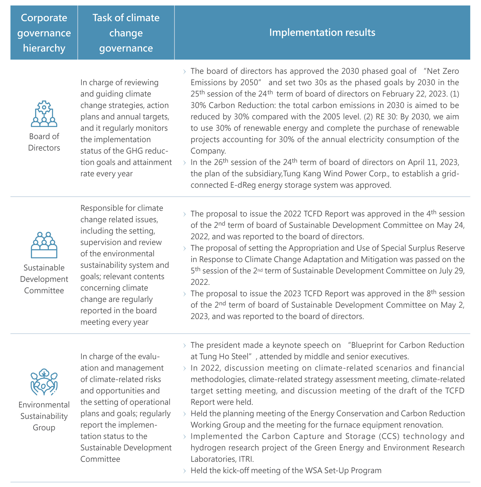 The board of directors has set up the Sustainable Development Committee(functional committee) composed of three members, and more than 50% of the members are independent directors appointed in accordance with the resolution of the board, with the chairman of the board serving as the convener (chair), responsible for climate change related issues, including the setting, supervision and review of the environmental sustainability system and goals. Sustainable Development Committee is convened twice a year, and relevant contents concerning climate change are regularly reported in the board meeting every year, and discussions on GHG inventory and reports on the schedules and planning are conducted in the board of directors on a quarterly basis. Risk management, strategies, and goals related to climate change in this Report were set and approved in the 27th session of the 24th term of board of directors dated on May 9, 2023. The board of directors also actively participates in discussions between the government and the industry to face the challenges for sustainability development brought by climate change in a pragmatic and forward-looking attitude.