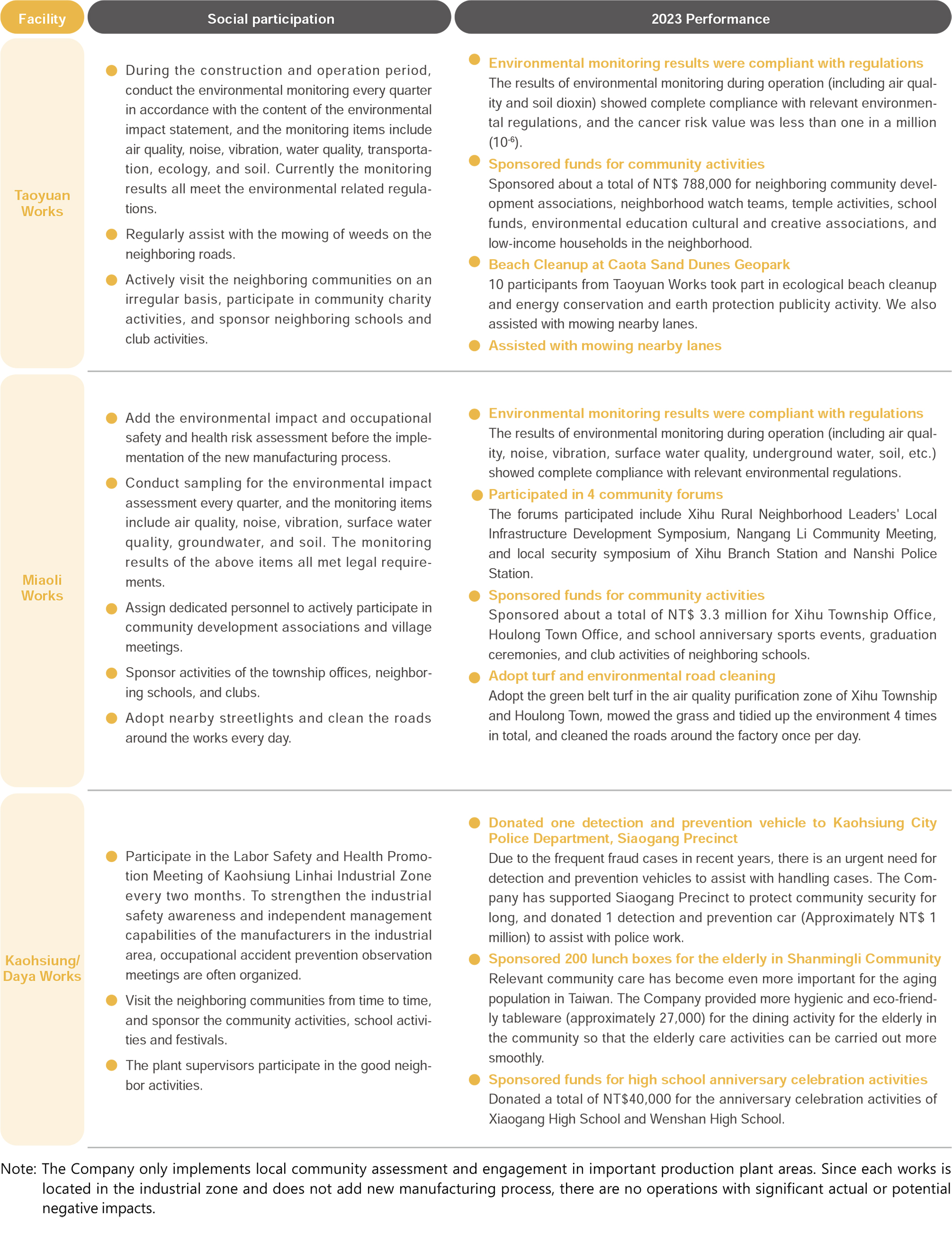 The Company attaches great important to the interaction with the residents in the neighborhood. We conduct regular environmental monitoring to let the stakeholders (community residents) understand that the environmental monitoring items meet the legal requirements. We invest in environmental protection and engage in good neighbor activities like community charity activities to reduce environmental safety risk of the neighbors, promote the interaction with the neighboring residents, and fulfill our corporate responsibility.