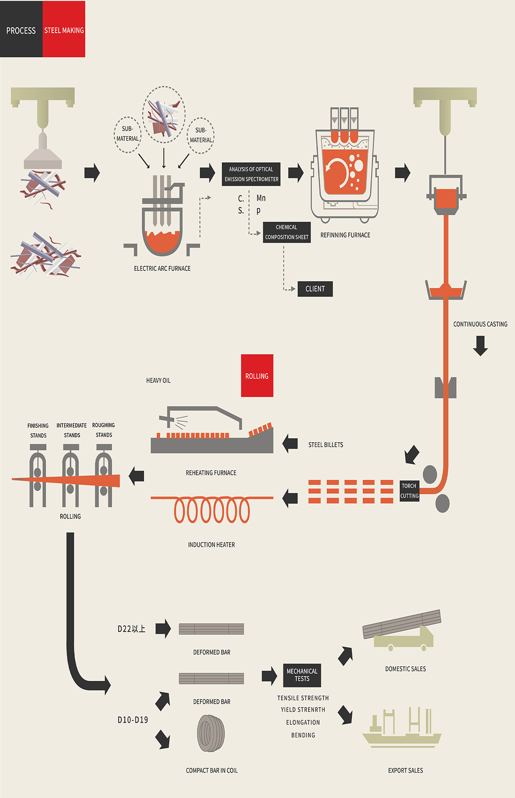 The Taoyuan Works utilizes optimized configurations and equipment performance improvements in steelmaking and rolling production lines, and has introduced the world’s most advanced direct rolling process. This has resulted in the production cycle from raw materials to output of finished rebar products to be shortened from more than 3 hours in the past to less than 2 hours, resulting in significant improvements to production efficiency, and making it a specialized rebar manufacturing plant focusing on energy conservation and environmental protection, in addition to production efficiency.