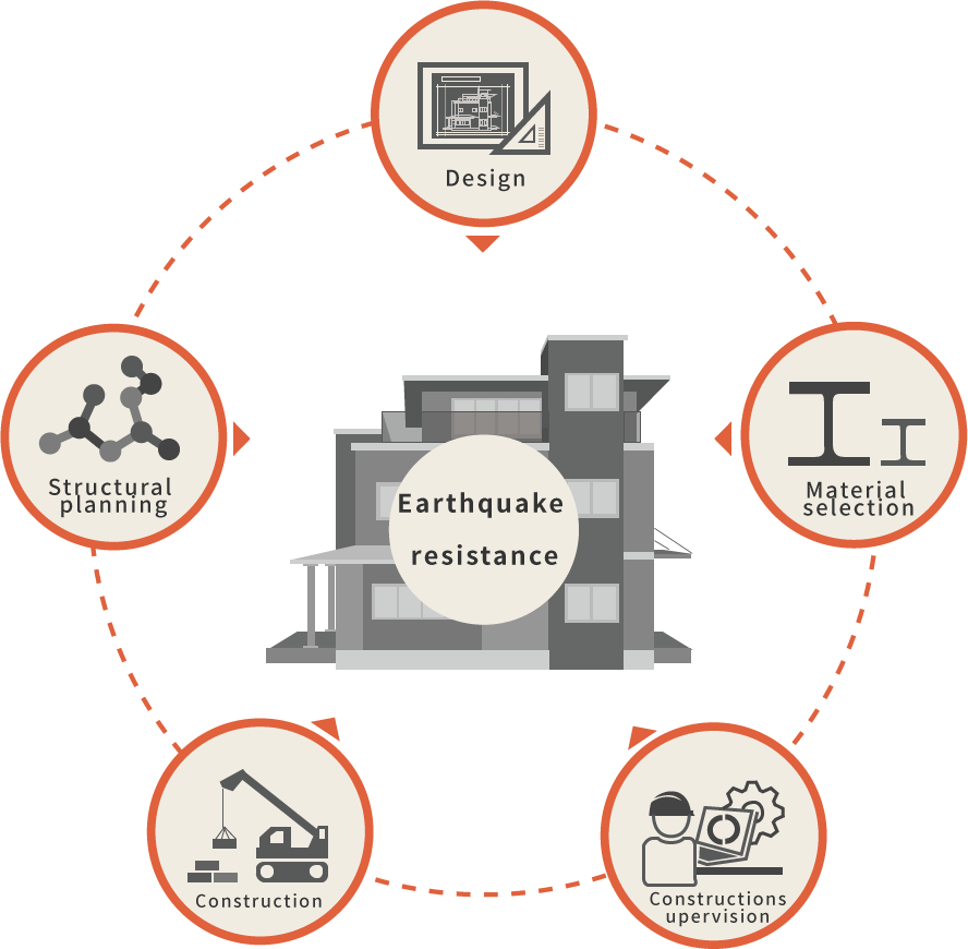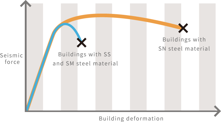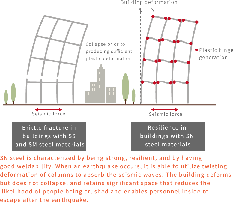 Since the 1995 Hanshin Earthquake, Japan has made SN steel its sole steel building material that complies with earthquake-resistant design. SN steel is characterized by being strong, resilient, and by having good weldability. Compared to steel of other specifications, it is the steel most able to withstand earthquakes.