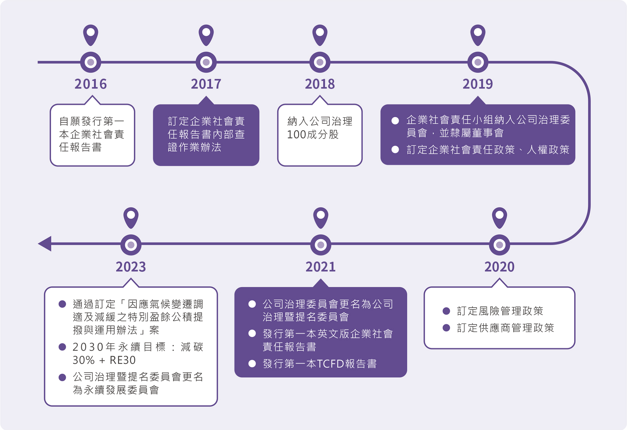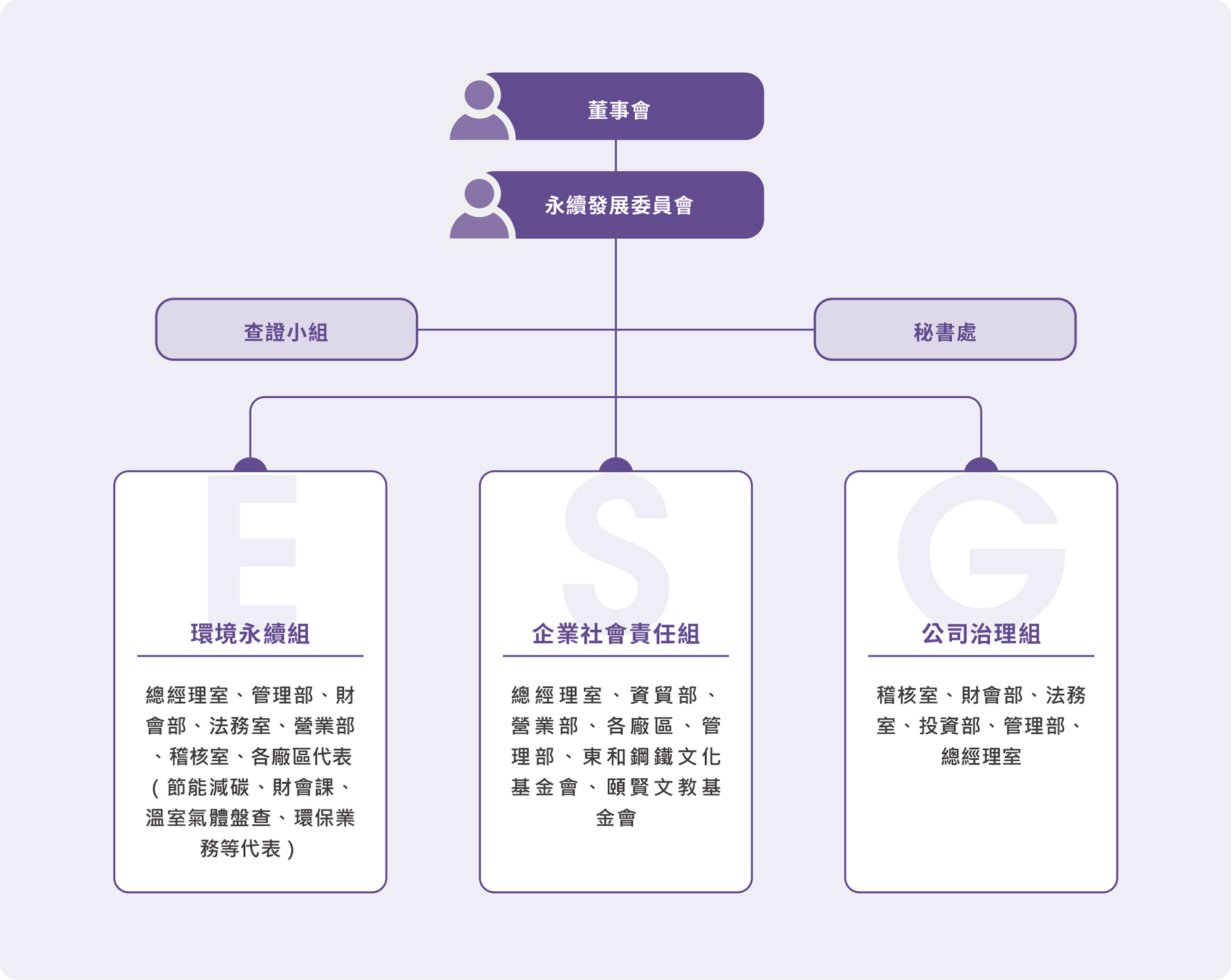 成員涵蓋總公司各單位、各廠區(qū)及基金會等部門代表,並由管理部負責秘書處業(yè)務(wù),包含整體規(guī)劃、溝通整合、資料彙整及永續(xù)報告書編輯修訂。