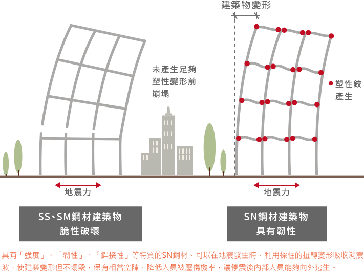 日本自1995年阪神大地震後,確立SN鋼材是唯一符合耐震設(shè)計(jì)的建築鋼材,具有「強(qiáng)度」、「韌性」、「銲接性」等特質(zhì)的SN鋼材,與其它規(guī)格鋼材相比是目前最能承受地震的鋼材。